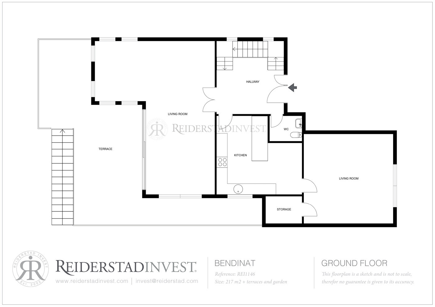 The ground floor features an impressive entrance hall with a double-height ceiling, two spacious living rooms, a fully equipped kitchen, and a charming covered terrace with direct access to the garden and pool area. On the first floor, you’ll find three bedrooms, two bathrooms, and a balcony. The lower level includes the guest apartment along with ample storage space.