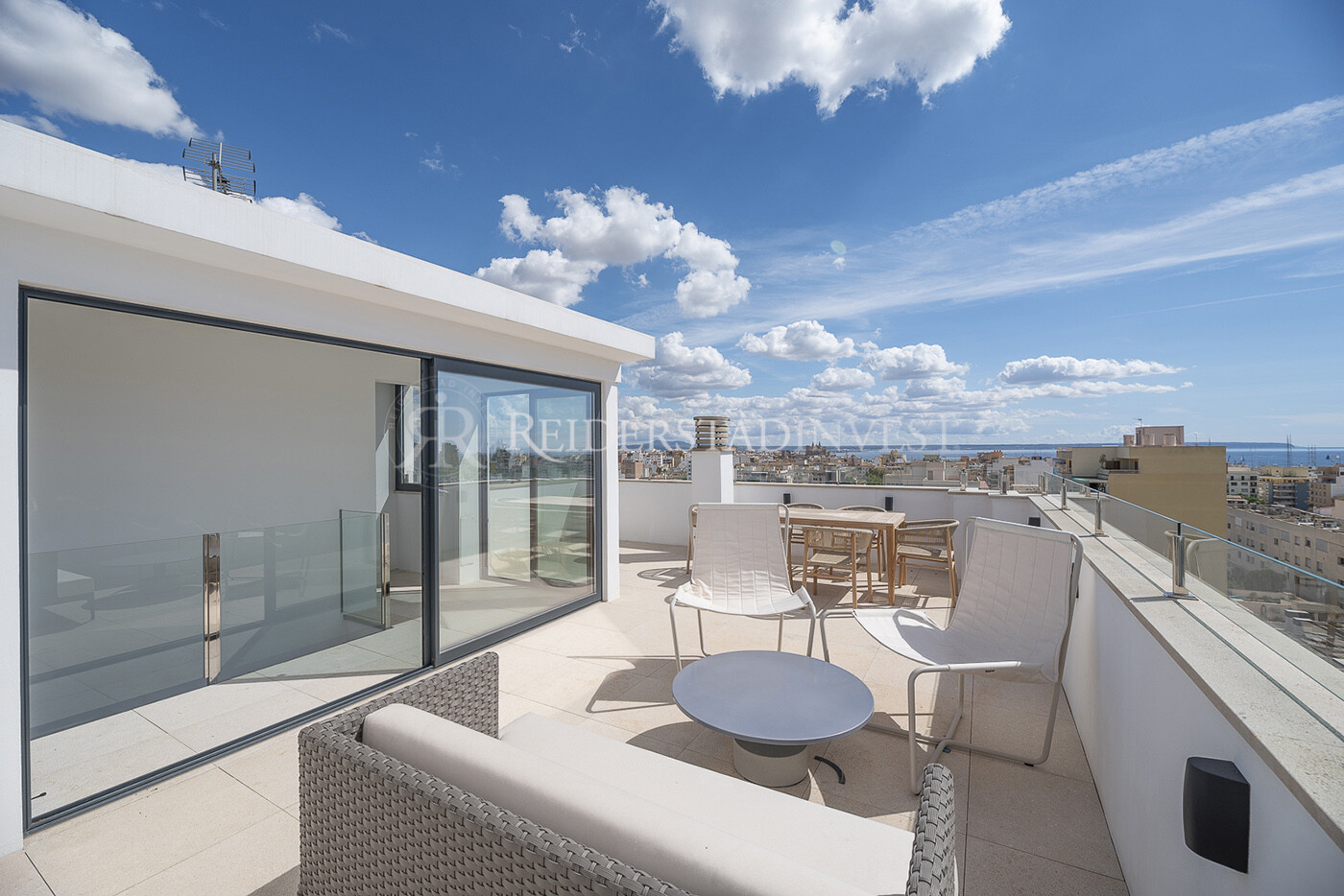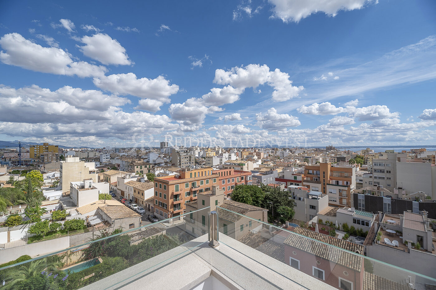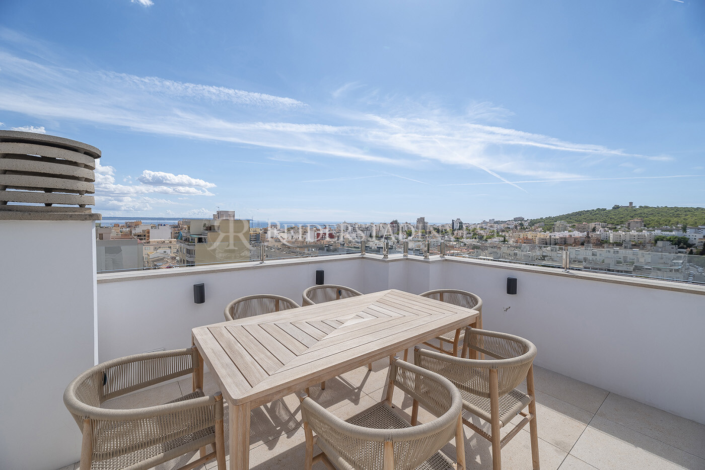 A few steps higher, you’ll reach the highlight of this home — a private roof terrace with impressive 360° views over Palma city and the bay. It’s the perfect place to enjoy the sun, entertain friends, or simply unwind in total privacy.