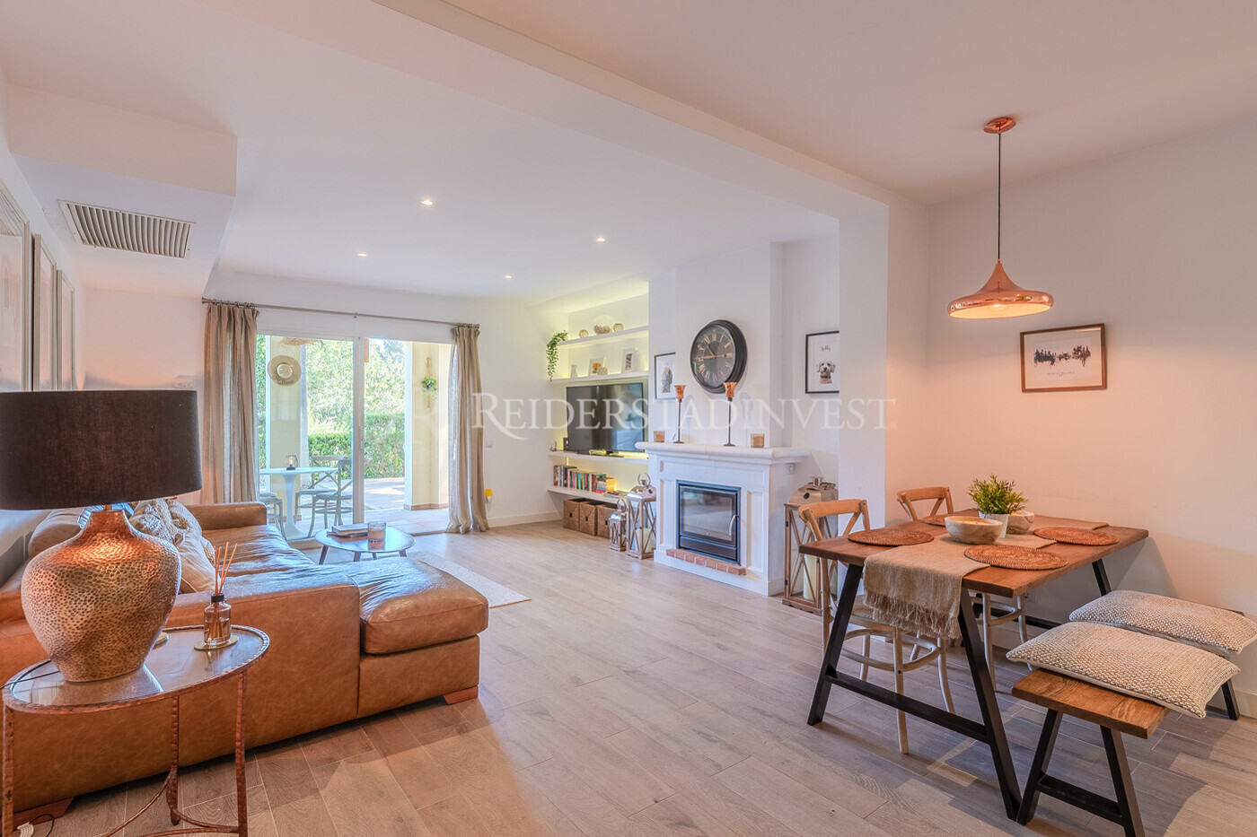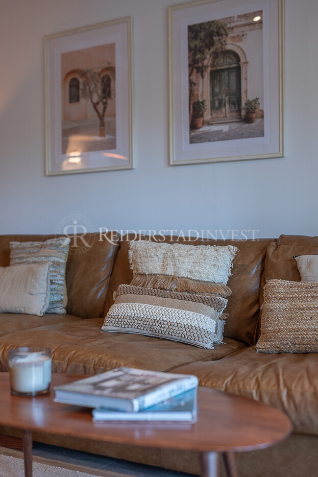 Bostaden imponerar med sin fräscha, moderna charm och ljusa, eleganta design. Den erbjuder två rymliga sovrum och två moderna badrum, perfekt anpassade för ett bekvämt boende året runt eller som ett lyxigt semesterboende. Det inbjudande vardagsrummet med matplats skapar en varm och trivsam atmosfär, förstärkt av en mysig, öppen spis – idealisk för svalare kvällar.