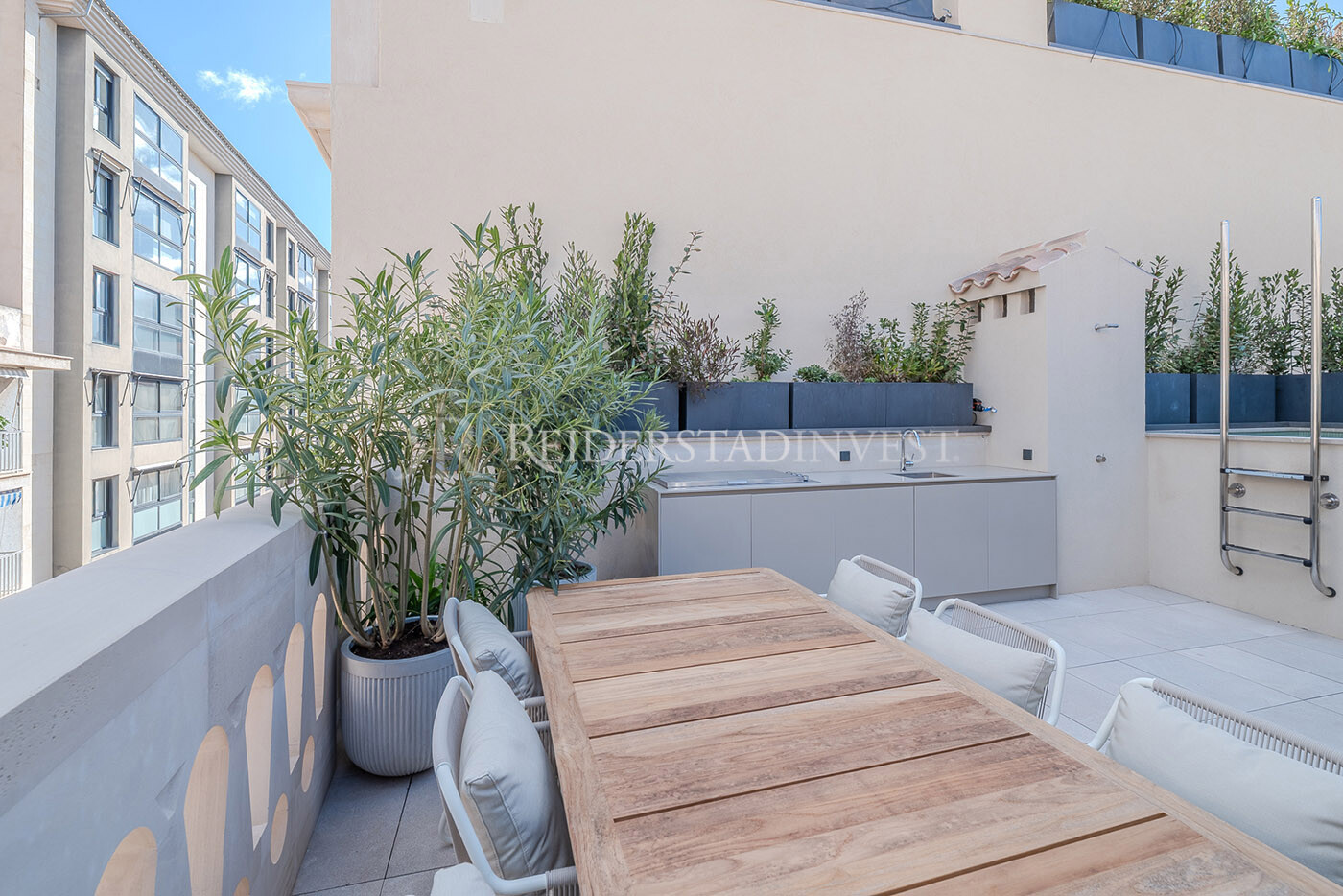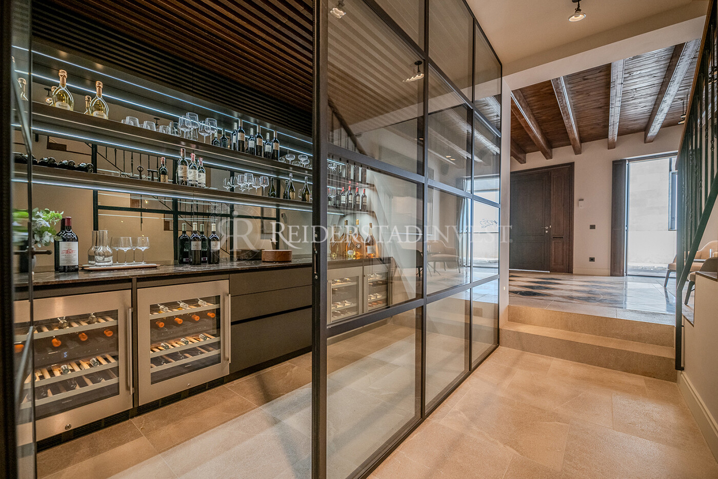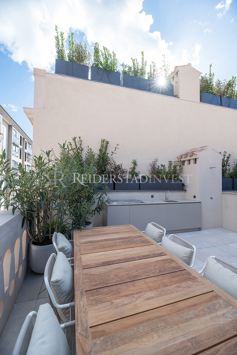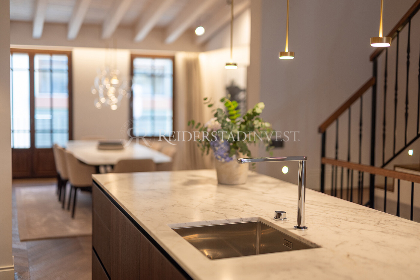 Vi är glada att kunna presentera vårt exklusiva, unika och sofistikerade townhouse med särskilt fokus på arkitektur, design och kvalitet i hjärtat av Gamla stan i Palma. Den nya byggnadens unika identitet har skapats med sina imponerande träbjälkar, höga tak och som kompletterar designen med ädla material som sten, trä, järn och linne, som alla kombineras skapar en elegant och välkomnande atmosfär. En hög komfortnivå är designad för att vara en väsentlig del av byggnadens karaktär med tidlös och modern inredning, med högkvalitativa varumärken som Poliform, Bang & Olufsen, Gaggenau, Roda och Giopato & Coombes. Byggytan på 324 m2 är fördelad över 4 våningar inklusive takterrassen på 42 m2. Fastighetens ingång ligger på gatan Socors, där du kommer in i en rymlig foajé med en vinbar och en passage som leder till privat garage, tvättstuga, privat hiss och trappor till de övre våningarna. Första våningen har 3 sovrum och stora fönster från golv till tak som ger ett underbart naturligt ljus. Andra våningen upptas av det klokt utformade öppna köket, matsalen och vardagsrummet, med franska balkonger i båda riktningarna. Takterrassen är en privat oas, med egen pool, plats för solbäddar och utekök. Inuti detta radhus kommer du att bli förvånad över hur tyst och lugnt det är, med tanke på att du befinner dig mitt i Palmas livliga och pulserande stadskärna.