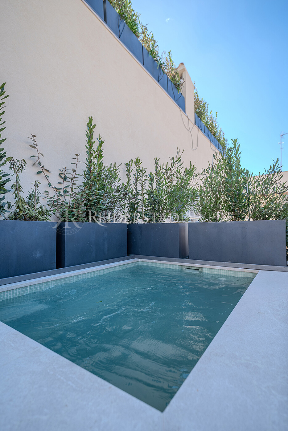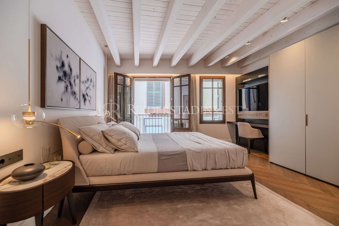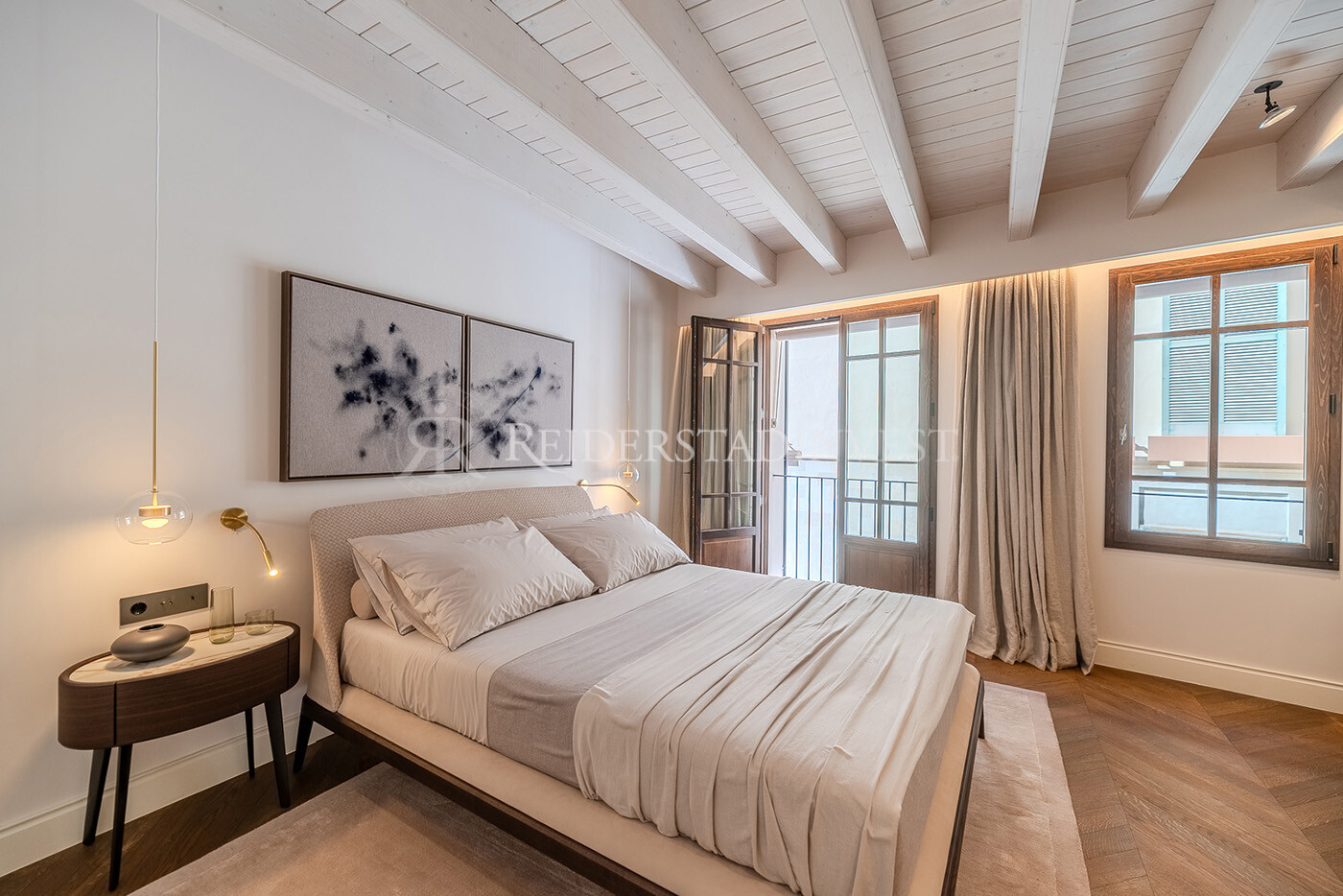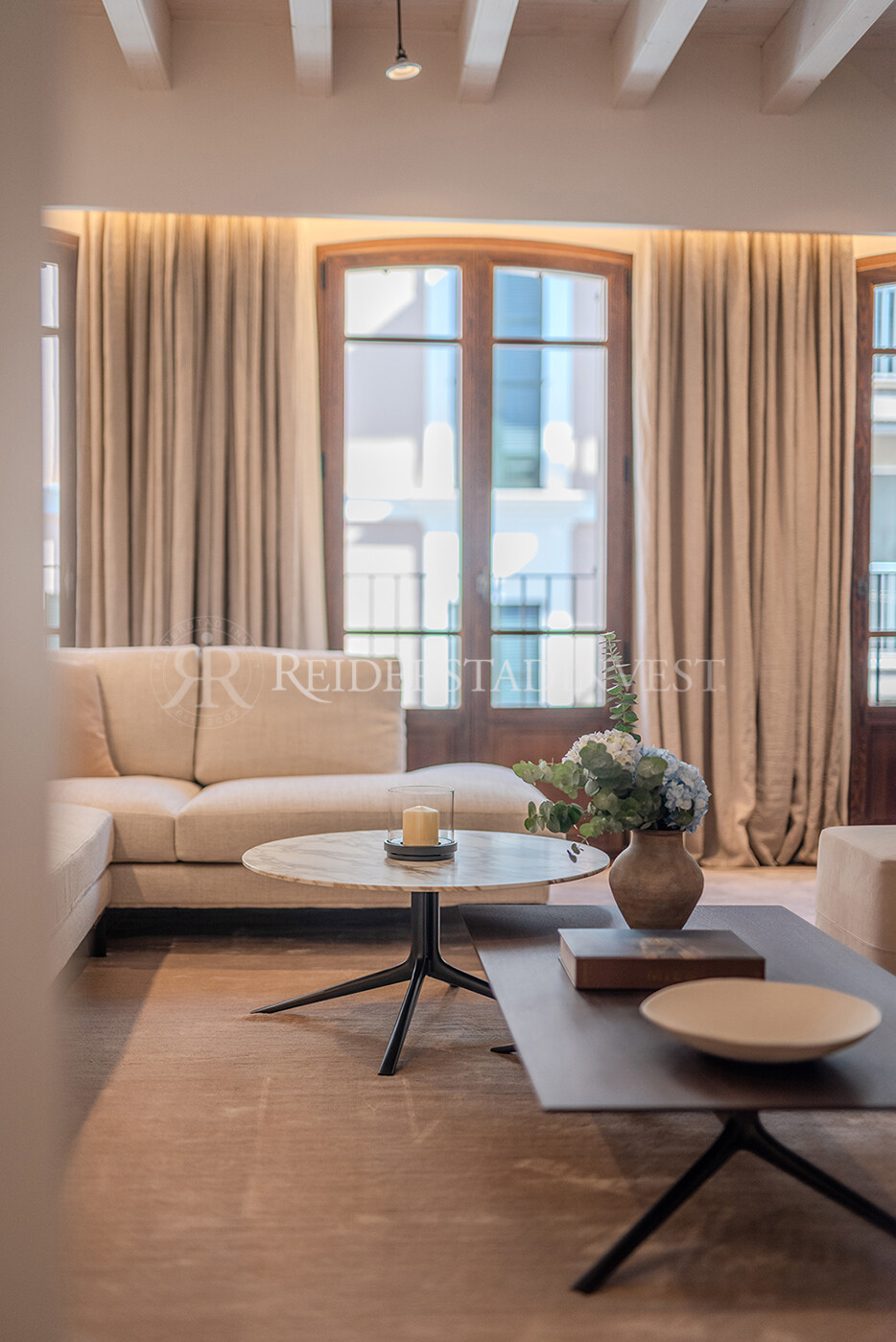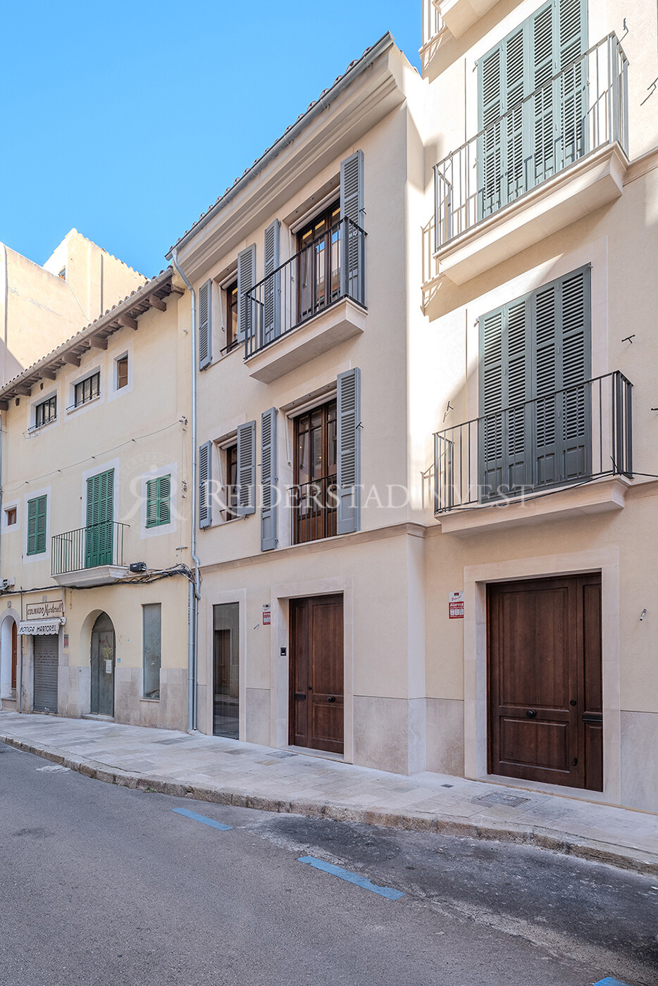Vi är glada att kunna presentera vårt exklusiva, unika och sofistikerade townhouse med särskilt fokus på arkitektur, design och kvalitet i hjärtat av Gamla stan i Palma. Den nya byggnadens unika identitet har skapats med sina imponerande träbjälkar, höga tak och som kompletterar designen med ädla material som sten, trä, järn och linne, som alla kombineras skapar en elegant och välkomnande atmosfär. En hög komfortnivå är designad för att vara en väsentlig del av byggnadens karaktär med tidlös och modern inredning, med högkvalitativa varumärken som Poliform, Bang & Olufsen, Gaggenau, Roda och Giopato & Coombes. Byggytan på 324 m2 är fördelad över 4 våningar inklusive takterrassen på 42 m2. Fastighetens ingång ligger på gatan Socors, där du kommer in i en rymlig foajé med en vinbar och en passage som leder till privat garage, tvättstuga, privat hiss och trappor till de övre våningarna. Första våningen har 3 sovrum och stora fönster från golv till tak som ger ett underbart naturligt ljus. Andra våningen upptas av det klokt utformade öppna köket, matsalen och vardagsrummet, med franska balkonger i båda riktningarna. Takterrassen är en privat oas, med egen pool, plats för solbäddar och utekök. Inuti detta radhus kommer du att bli förvånad över hur tyst och lugnt det är, med tanke på att du befinner dig mitt i Palmas livliga och pulserande stadskärna.