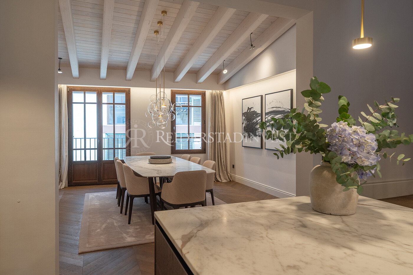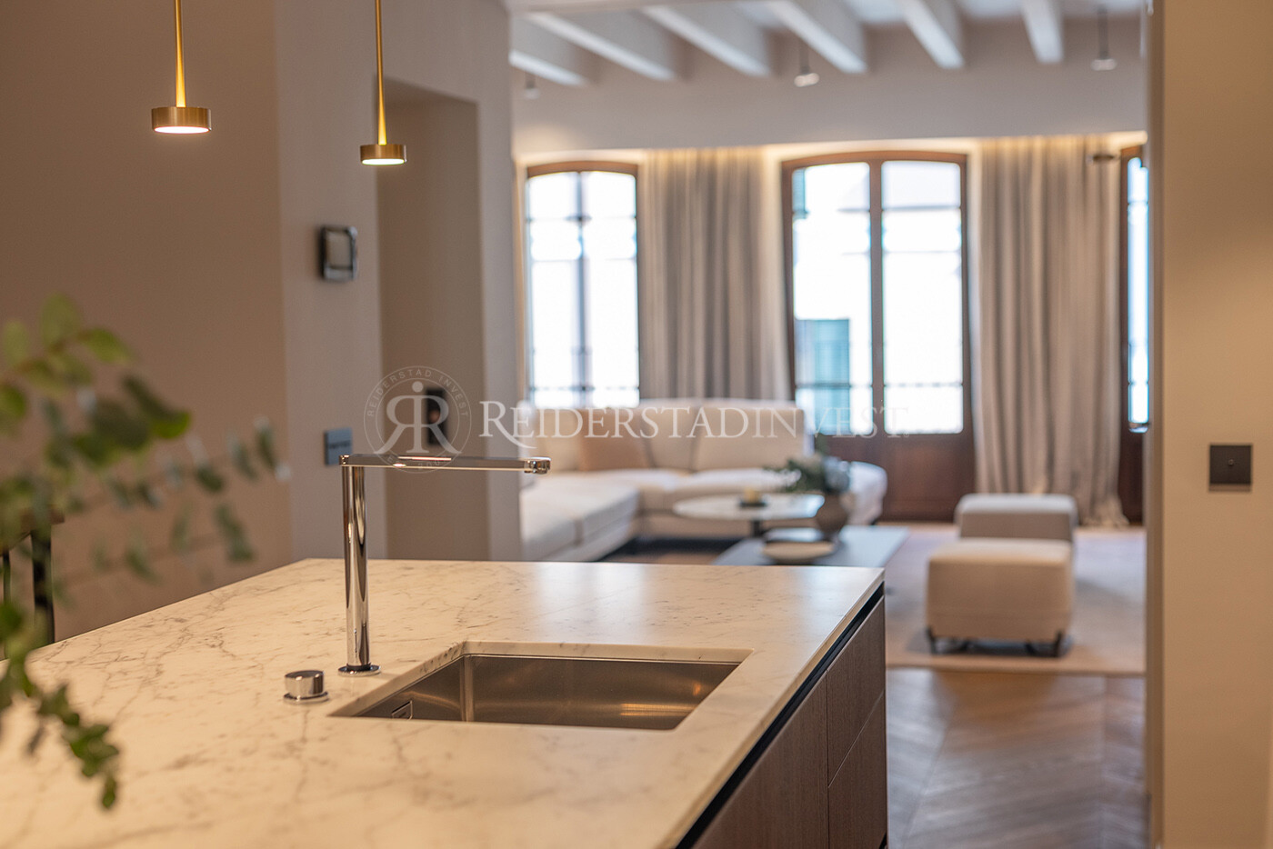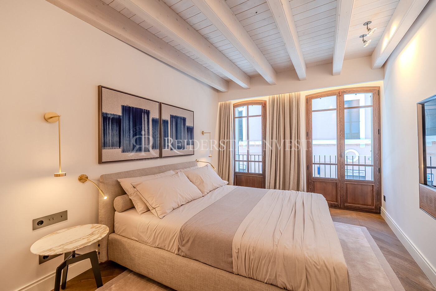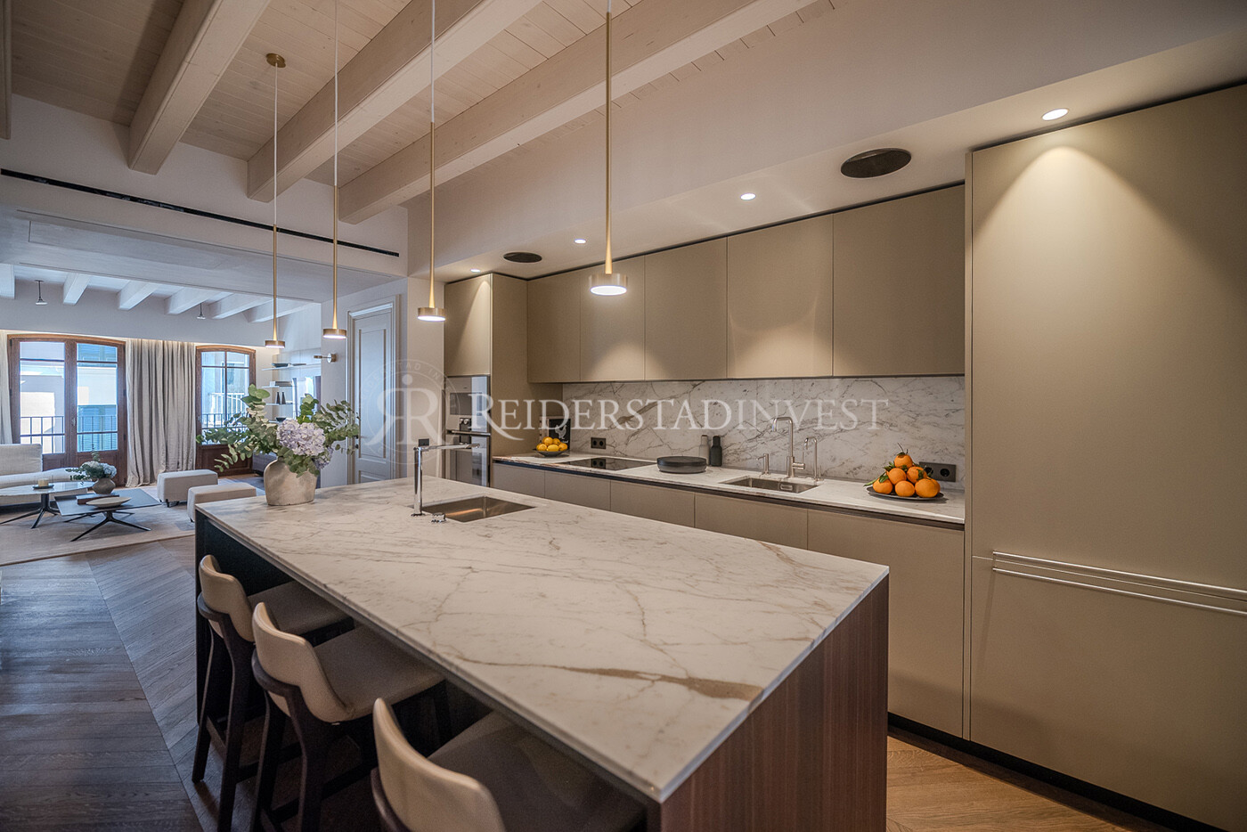 Vi är glada att kunna presentera vårt exklusiva, unika och sofistikerade townhouse med särskilt fokus på arkitektur, design och kvalitet i hjärtat av Gamla stan i Palma. Den nya byggnadens unika identitet har skapats med sina imponerande träbjälkar, höga tak och som kompletterar designen med ädla material som sten, trä, järn och linne, som alla kombineras skapar en elegant och välkomnande atmosfär. En hög komfortnivå är designad för att vara en väsentlig del av byggnadens karaktär med tidlös och modern inredning, med högkvalitativa varumärken som Poliform, Bang & Olufsen, Gaggenau, Roda och Giopato & Coombes. Byggytan på 324 m2 är fördelad över 4 våningar inklusive takterrassen på 42 m2. Fastighetens ingång ligger på gatan Socors, där du kommer in i en rymlig foajé med en vinbar och en passage som leder till privat garage, tvättstuga, privat hiss och trappor till de övre våningarna. Första våningen har 3 sovrum och stora fönster från golv till tak som ger ett underbart naturligt ljus. Andra våningen upptas av det klokt utformade öppna köket, matsalen och vardagsrummet, med franska balkonger i båda riktningarna. Takterrassen är en privat oas, med egen pool, plats för solbäddar och utekök. Inuti detta radhus kommer du att bli förvånad över hur tyst och lugnt det är, med tanke på att du befinner dig mitt i Palmas livliga och pulserande stadskärna.