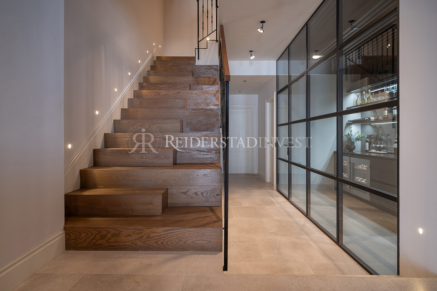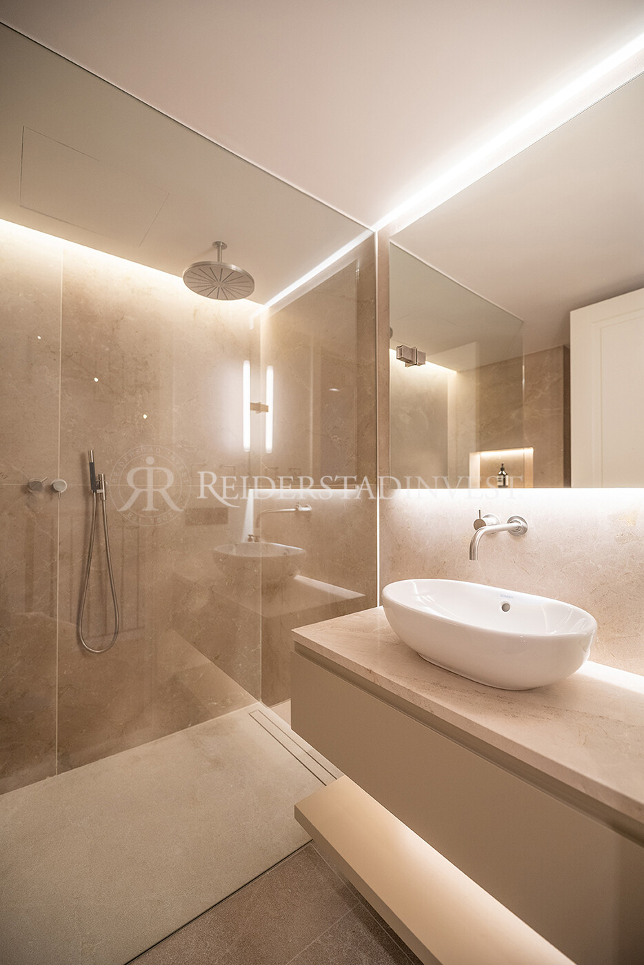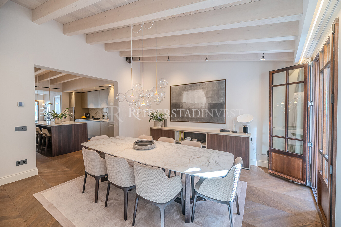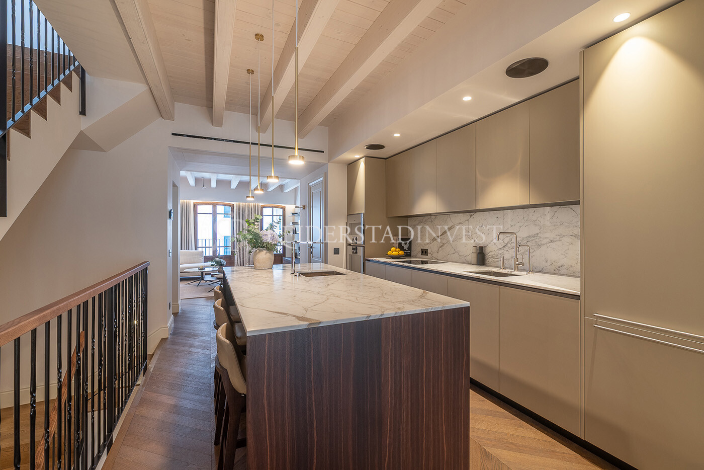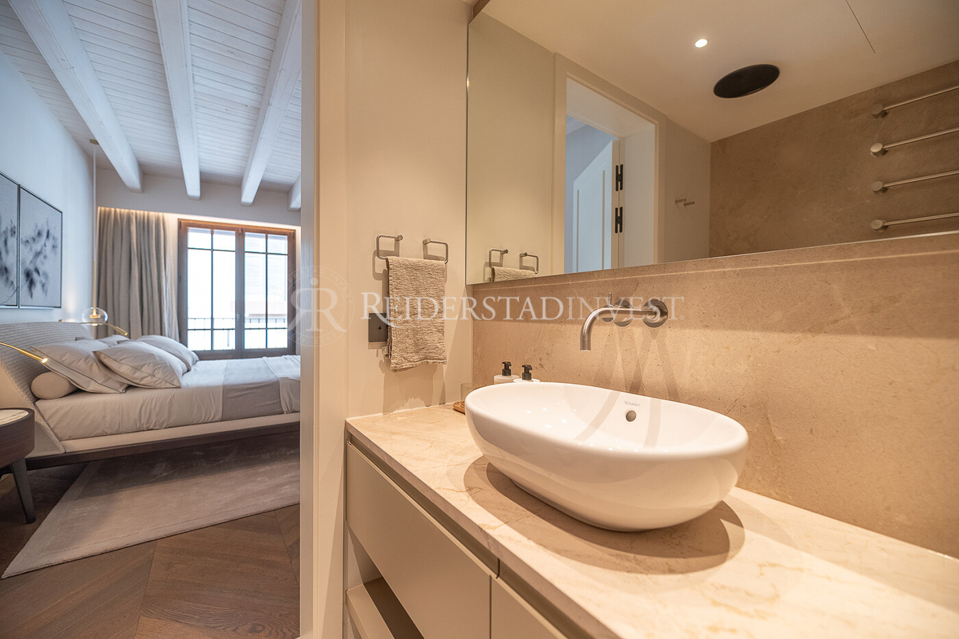 Vi är glada att kunna presentera vårt exklusiva, unika och sofistikerade townhouse med särskilt fokus på arkitektur, design och kvalitet i hjärtat av Gamla stan i Palma. Den nya byggnadens unika identitet har skapats med sina imponerande träbjälkar, höga tak och som kompletterar designen med ädla material som sten, trä, järn och linne, som alla kombineras skapar en elegant och välkomnande atmosfär. En hög komfortnivå är designad för att vara en väsentlig del av byggnadens karaktär med tidlös och modern inredning, med högkvalitativa varumärken som Poliform, Bang & Olufsen, Gaggenau, Roda och Giopato & Coombes. Byggytan på 324 m2 är fördelad över 4 våningar inklusive takterrassen på 42 m2. Fastighetens ingång ligger på gatan Socors, där du kommer in i en rymlig foajé med en vinbar och en passage som leder till privat garage, tvättstuga, privat hiss och trappor till de övre våningarna. Första våningen har 3 sovrum och stora fönster från golv till tak som ger ett underbart naturligt ljus. Andra våningen upptas av det klokt utformade öppna köket, matsalen och vardagsrummet, med franska balkonger i båda riktningarna. Takterrassen är en privat oas, med egen pool, plats för solbäddar och utekök. Inuti detta radhus kommer du att bli förvånad över hur tyst och lugnt det är, med tanke på att du befinner dig mitt i Palmas livliga och pulserande stadskärna.