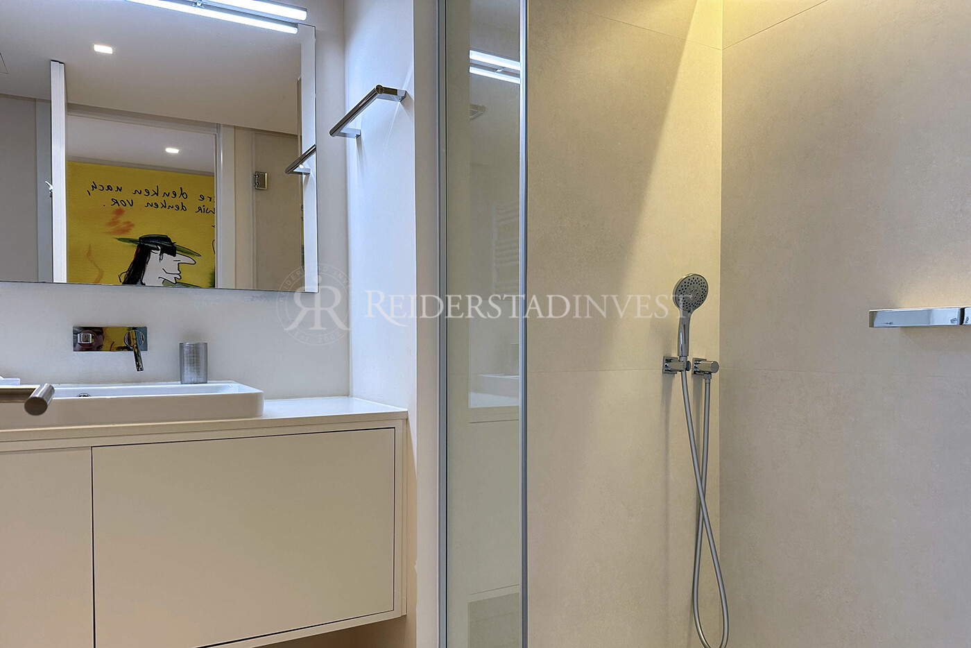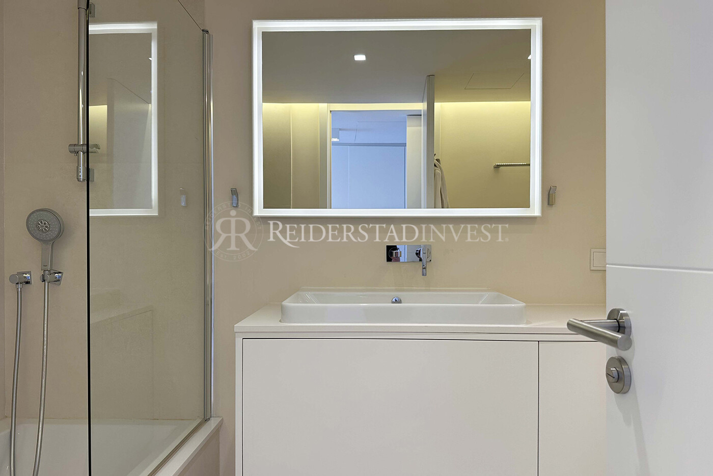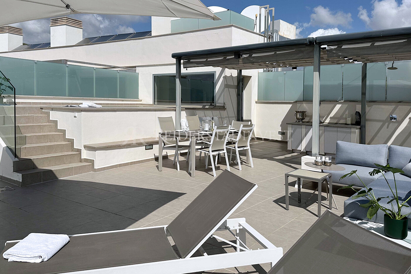 Denna exceptionella bostad har 3 sovrum plus ett extra rum på takterrassen (20 m²) med en-suite badrum, 128 m² boyta på huvudvåningen, en 25 m² stor terrass direkt utanför lägenheten och en 60 m² stor takterrass med privat pool, perfekt för avkoppling eller socialt sammankomster. Lägenheten ligger näst sist till vänster och erbjuder ultimat avskildhet och lugn.